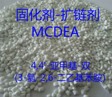 4,4'-亞甲基-雙(3-氯-2,6-二乙基苯胺),MCDEA與TDI預聚體有著良好地相容、配伍性,所制備的PU制品具有優良的物理以及動態力學性能,在PU的澆注、噴涂、RIM等工藝技術方法都可使用;在PU的彈性體、微孔制品、膠粘劑、涂層劑等制品制備中,都有著廣泛地應用,也可以用作環氧樹脂的固化劑以及供制備聚酰亞胺等所用.它與相應的 MOCA、740M等混合使用,可以使PU彈性體性能得以提高,體現了良好地疊加作用。